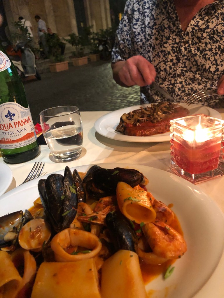 We had in mind to visit the Trastevere area for dinner which is known for being a colourful funky bohemian area where you can dine until late or enjoy live music, cobblestone streets with a lively atmosphere. Unfortunately, we were so tired that we only made it back to the laneways behind Piazza Navonna. I loved this area the previous evening so it was still so lovely.