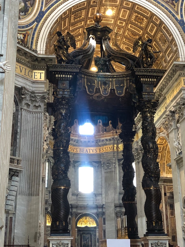 This area wasn’t so crowded so I enjoyed looking up at the spectacular ceiling and along the walls. I would have loved to stay longer and just look at things in detail. It was too hard with the crowds. We finally got to the outside garden area cafe, took a break and a Aperol Spritz. Then off we went into the heat and made it to St Peter’s Square.